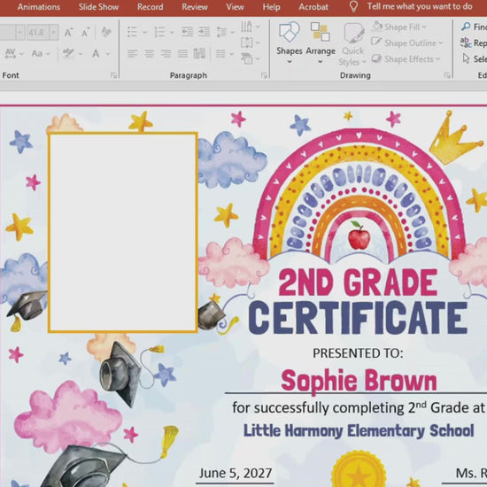 This set includes Two Graduation Award Styles (Photo and No-Photo Versions Included), making it easy to create a personalized keepsake for every child. You can also Choose the Award Title You Prefer (Diploma or Certificate) to match your classroom or school preference. All templates are fully editable in PDF and PowerPoint (background image is not editable), giving you flexibility and ease of use. The set includes a detailed, step-by-step guide with images and clear instructions to help you easily insert and perfectly embed your photo into the frame using PowerPoint.