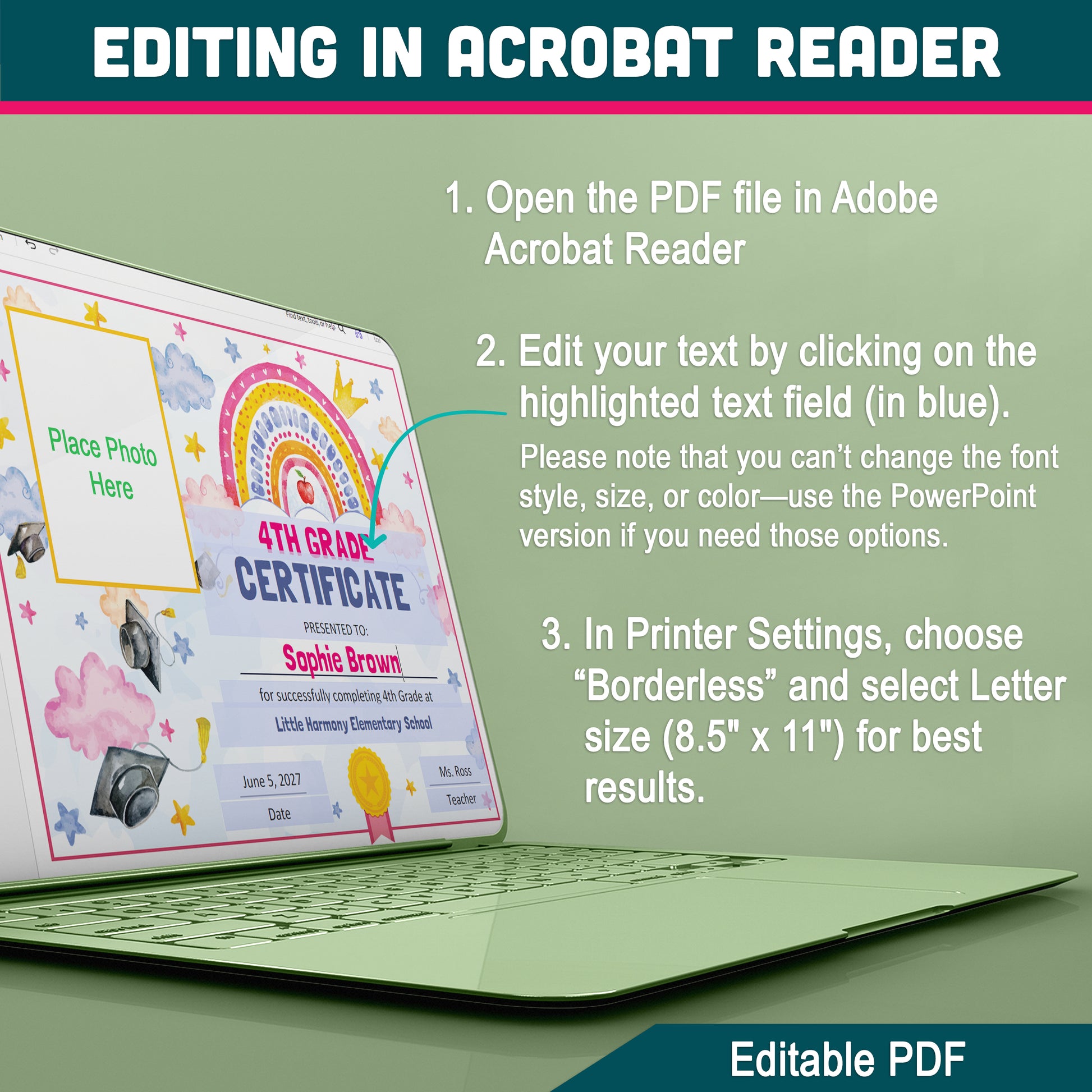 This resource includes Two Graduation Award Styles (Photo and No-Photo Versions Included), so you can choose the format that works best for your class. You can also Choose the Award Title You Prefer (Diploma or Certificate) for flexibility across different settings. All templates are fully editable in PDF and PowerPoint (background image is not editable), making last-minute edits simple. The set includes a detailed, step-by-step guide with images and clear instructions to help you easily insert and perfectly embed your photo into the frame using PowerPoint.