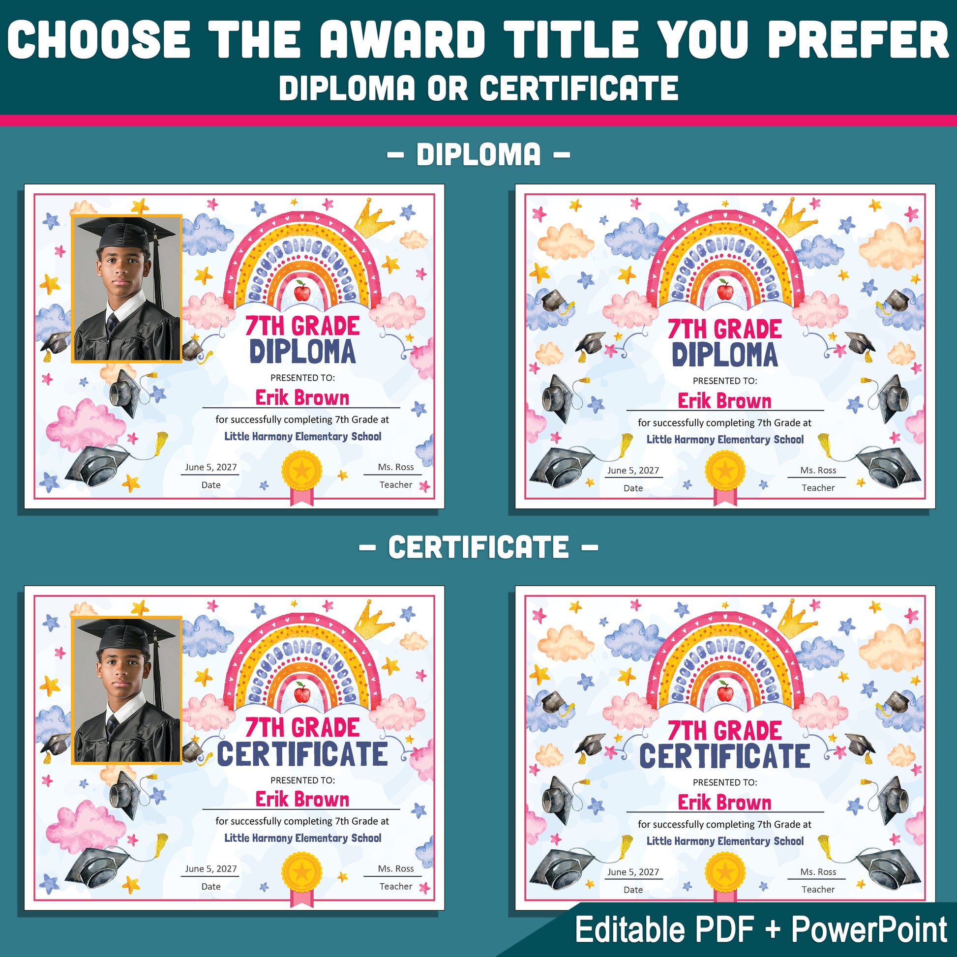 7th Grade Completion Certificate, Seventh Grade Graduation Moving Up Awards, Editable Rainbow Star Theme, Photo and No Photo, PDF and PowerPoint