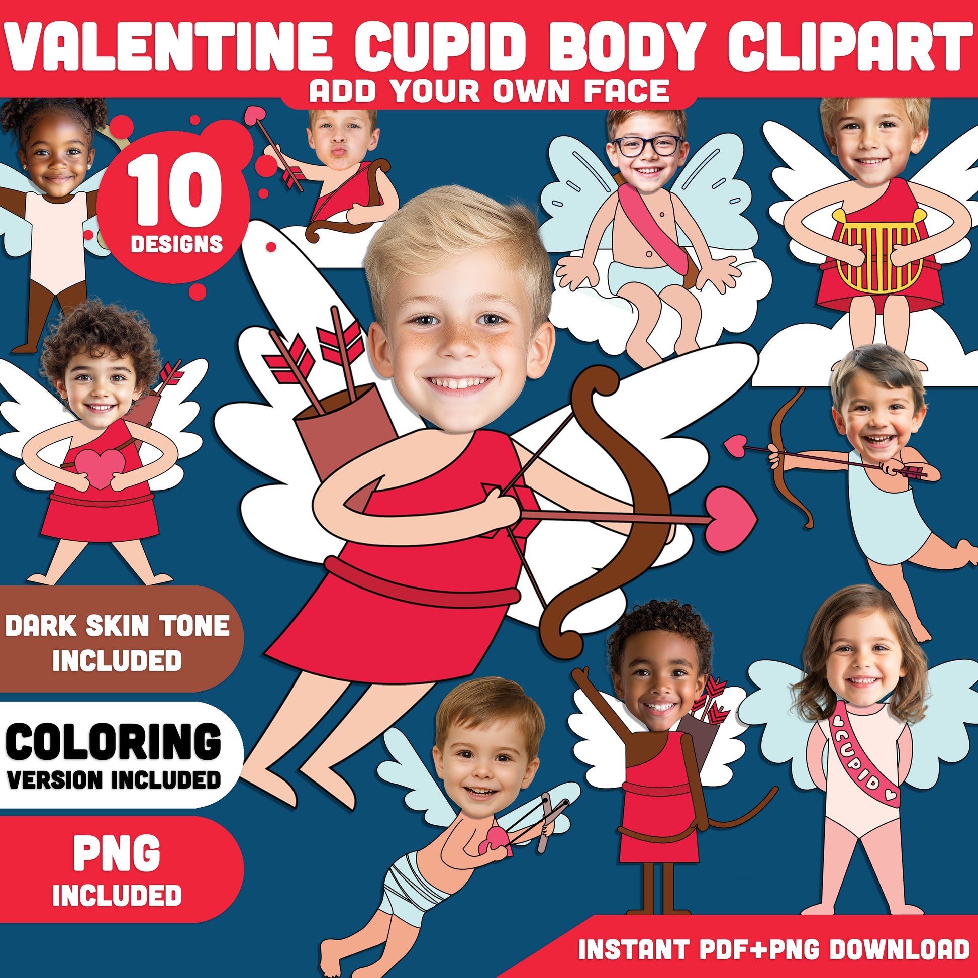 Cupid Add Your Photo Templates, Valentine Cut & Paste Add Your Own Face Craft, Bulletin Board Displays, 10 Unique Designs, Coloring Version Included
