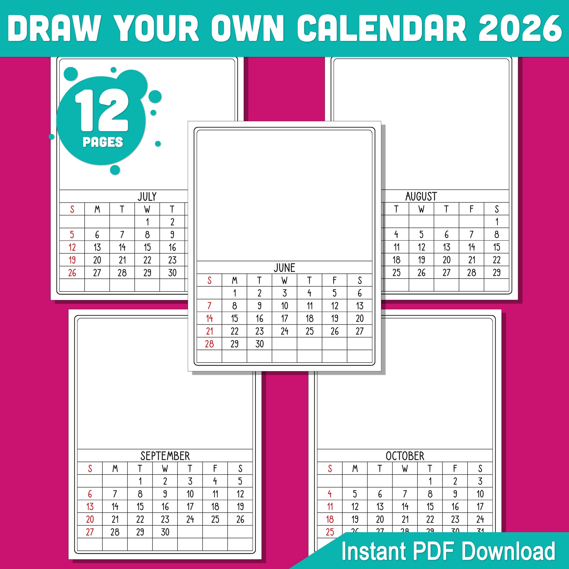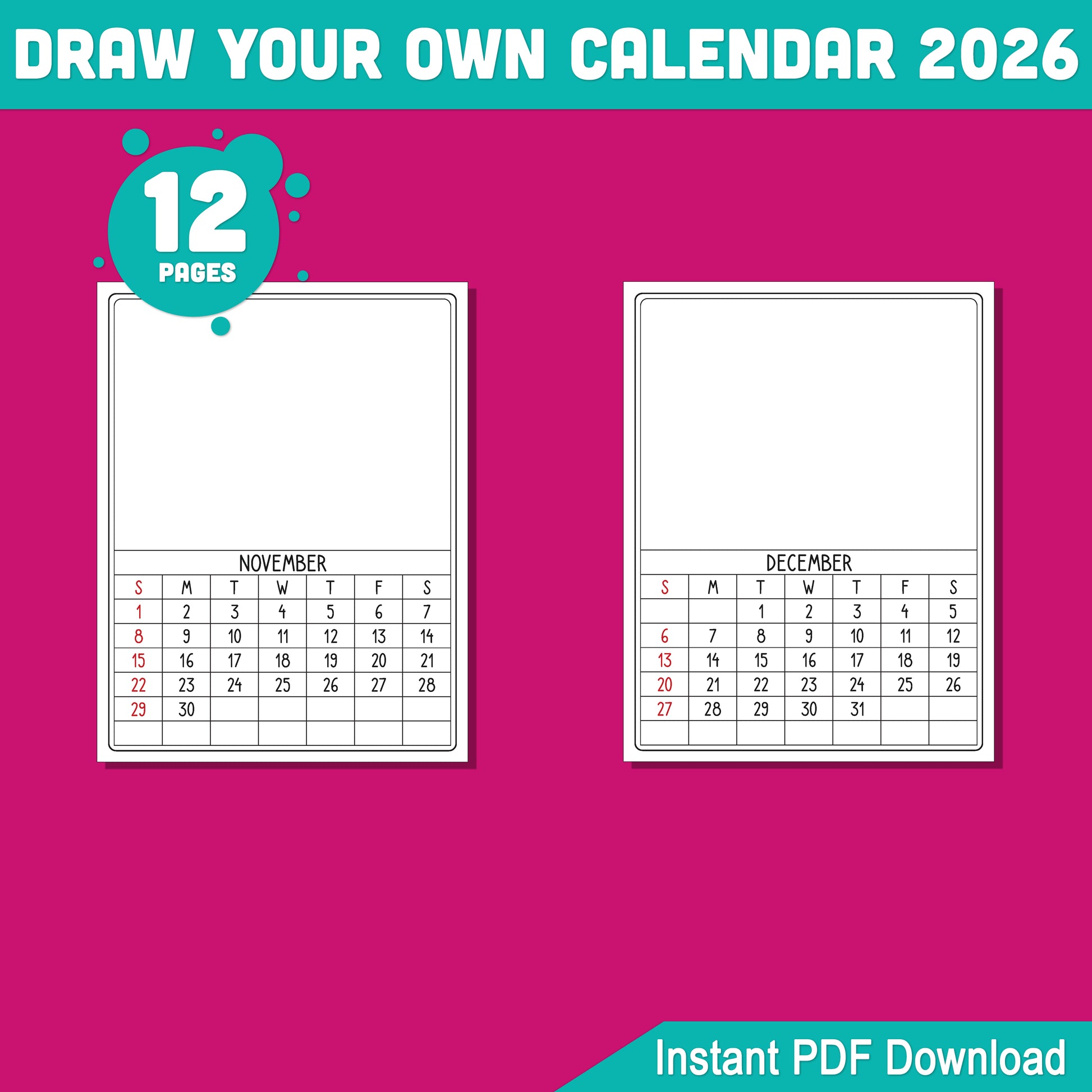 • You will receive 12 PDF calendar pages with blank spaces to draw your own designs for January through December (no images included).