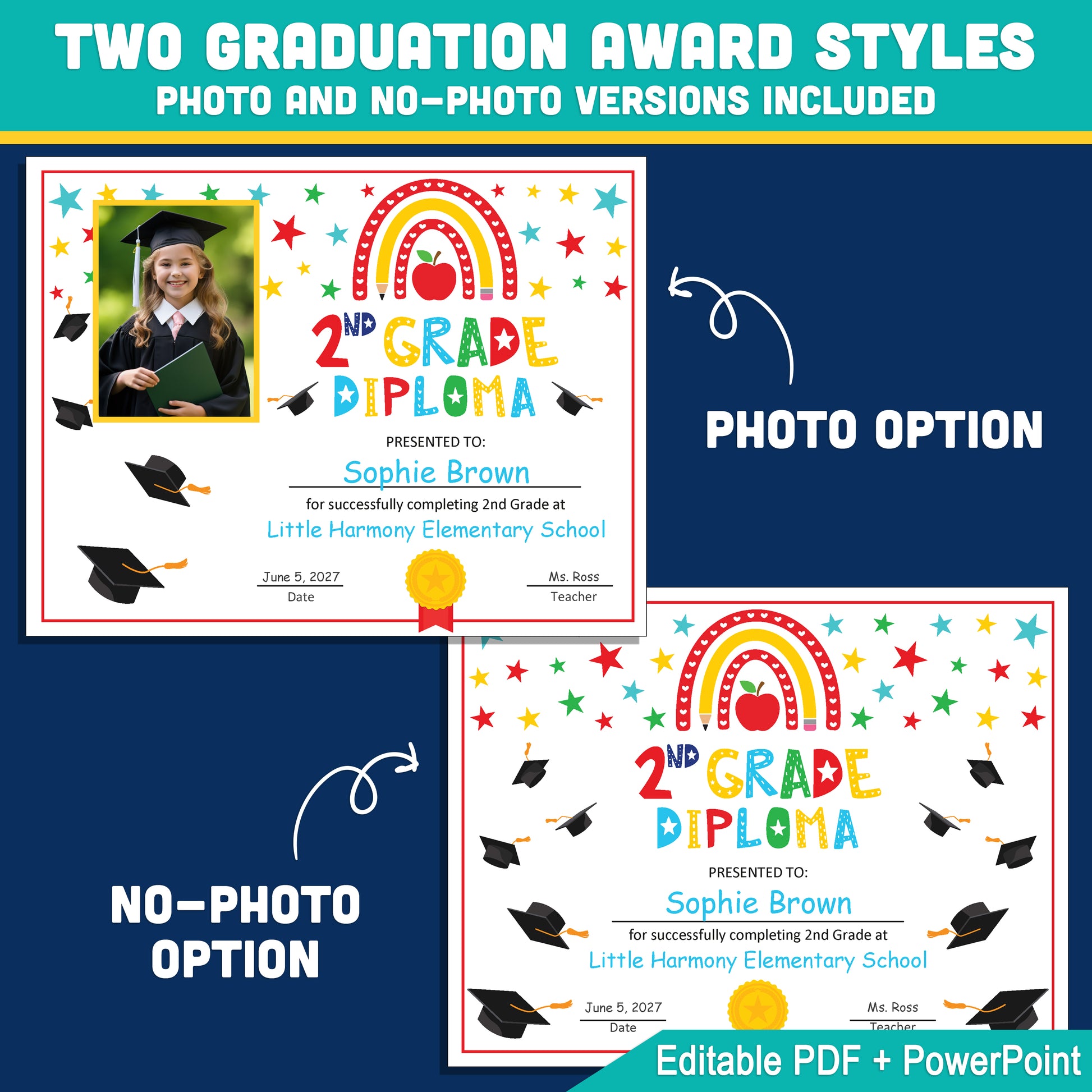 Editable 2nd Graduation Diploma & Certificate Set, Printable Rainbow Stars Awards, Photo and No-Photo Options, PDF, PowerPoint, Canva