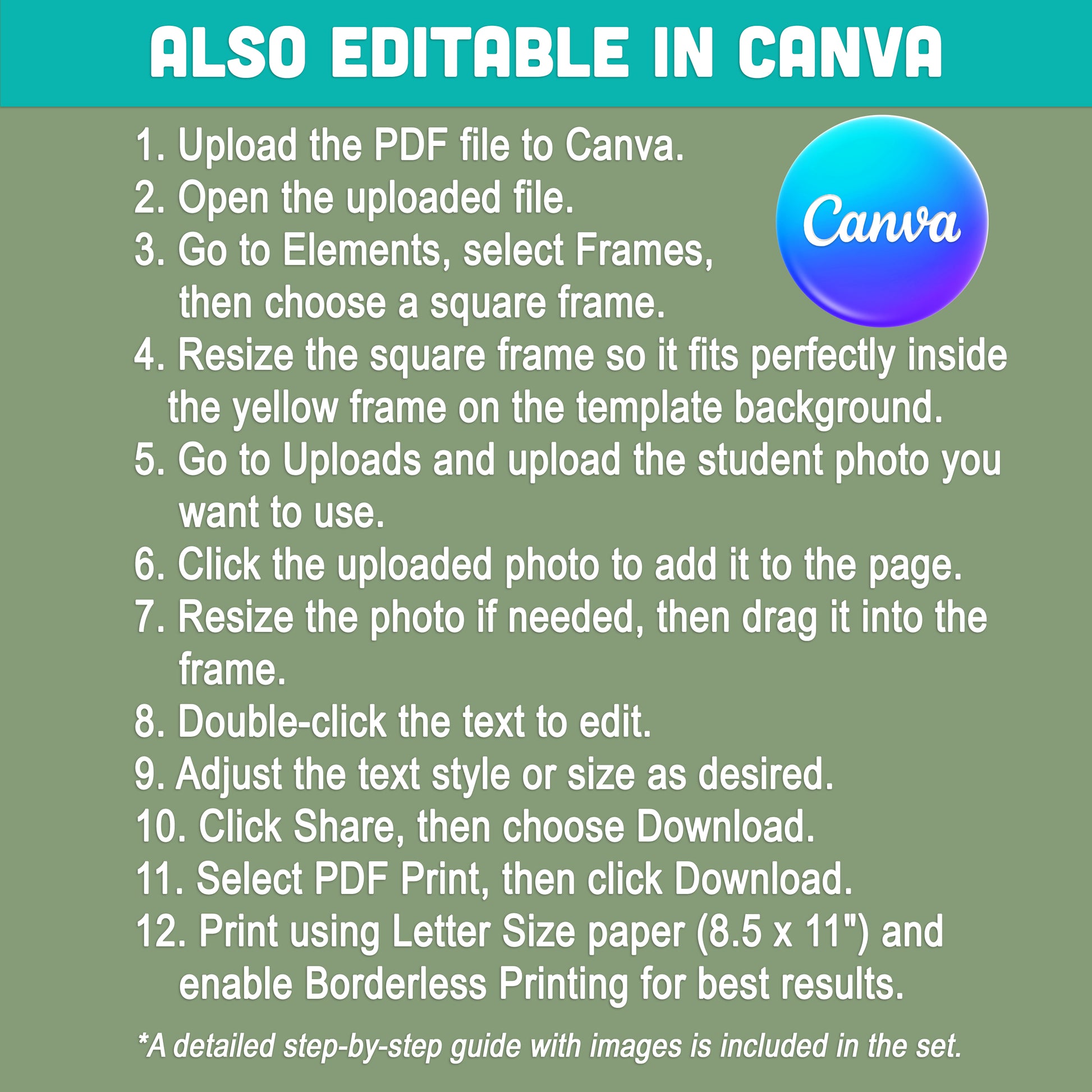 Inside the set, you will find Two Graduation Award Styles (Photo and No-Photo Versions Included) so you can decide whether to add student photos or keep a traditional award design. You can also choose the award title you prefer, Diploma or Certificate, giving you the freedom to match your classroom celebration. The templates are editable in PDF and PowerPoint, and they can also be edited easily in Canva by uploading the PDF file, providing simple and flexible editing options.