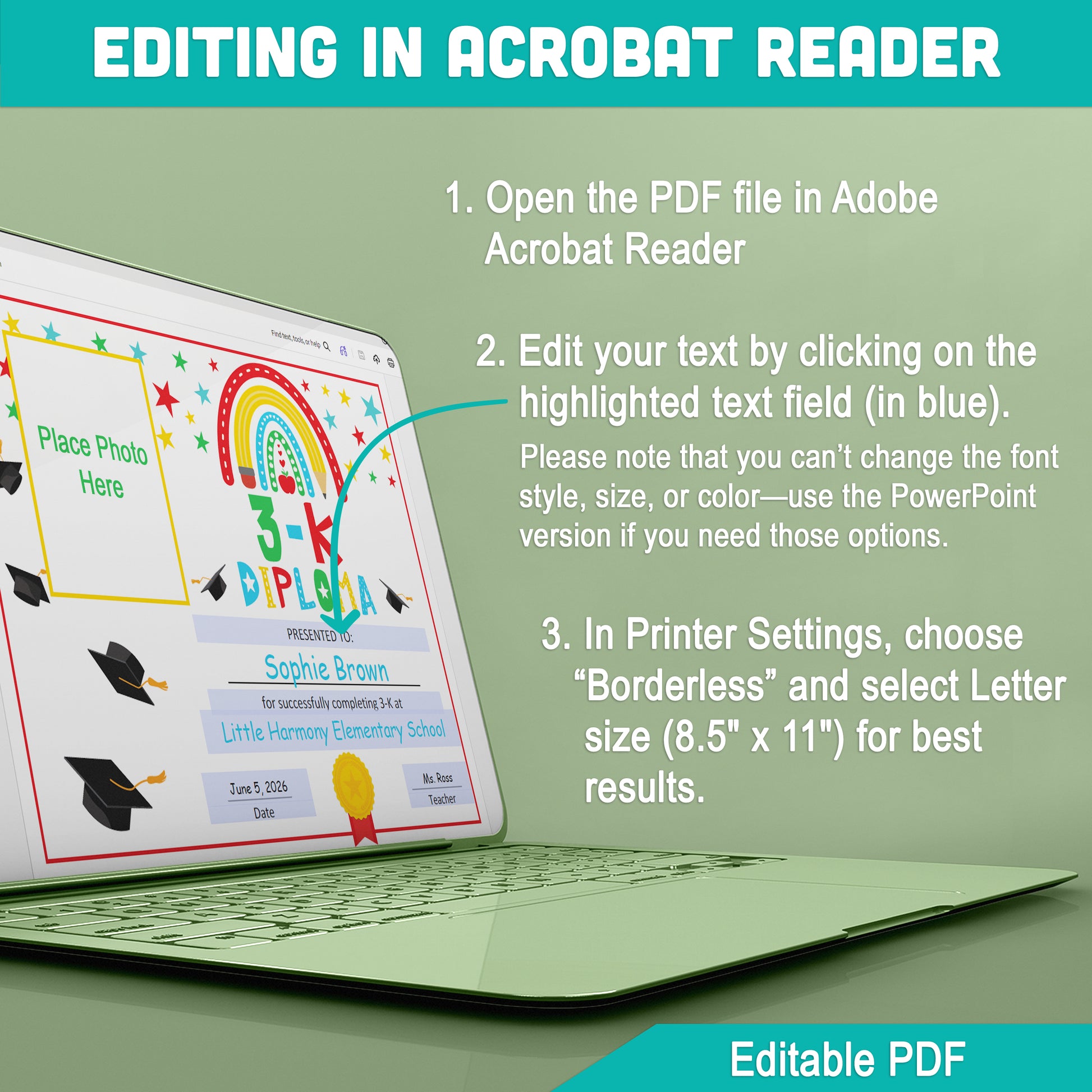 Editable 3-K Diploma with Photo Graduation Certificate Template, K-3 Photo Certificate Printable, Editable PDF and Editable PowerPoint, Letter Size
