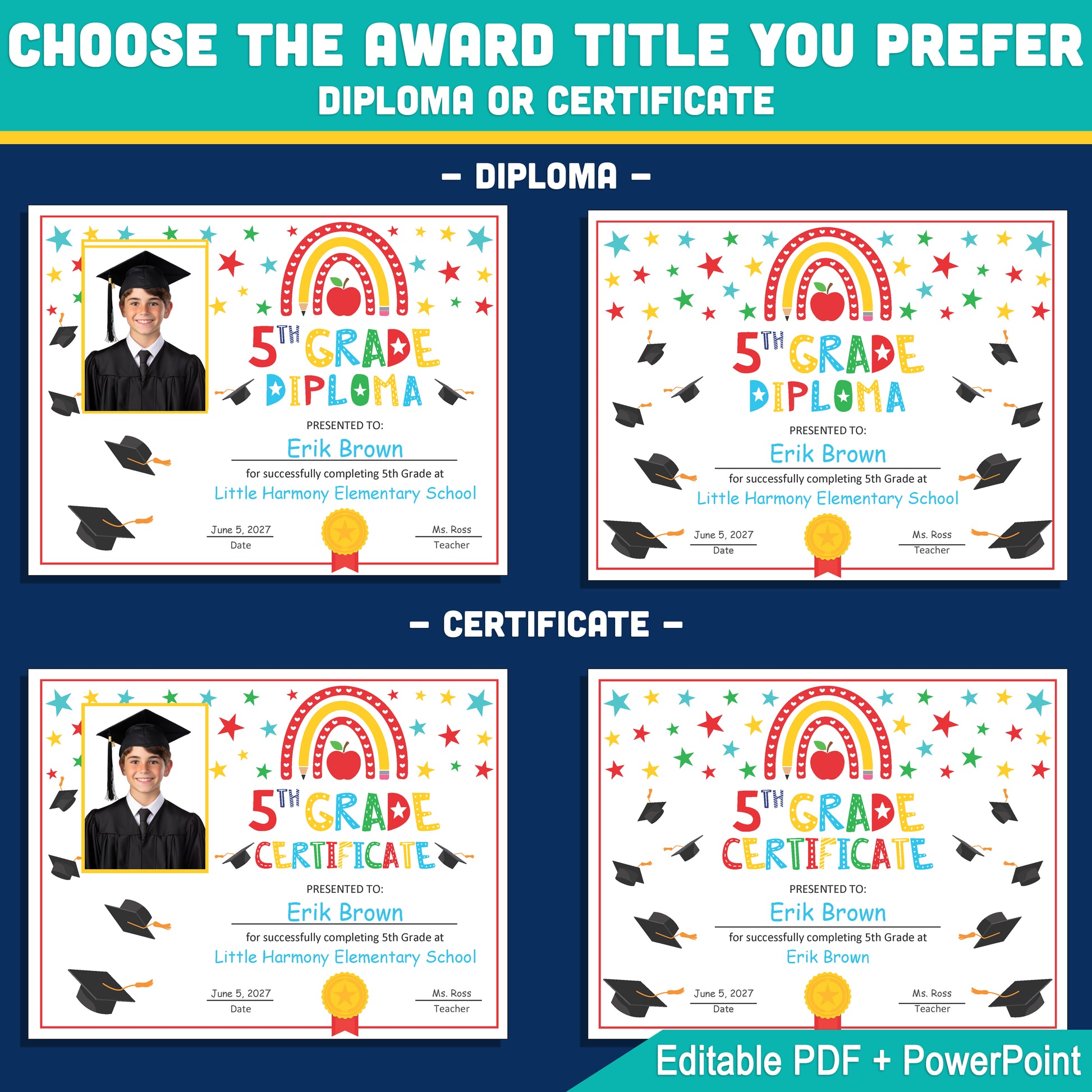 Editable 4th Graduation Diploma & Certificate Set, Printable Rainbow Stars Awards, Photo and No-Photo Options, PDF, PowerPoint, Canva