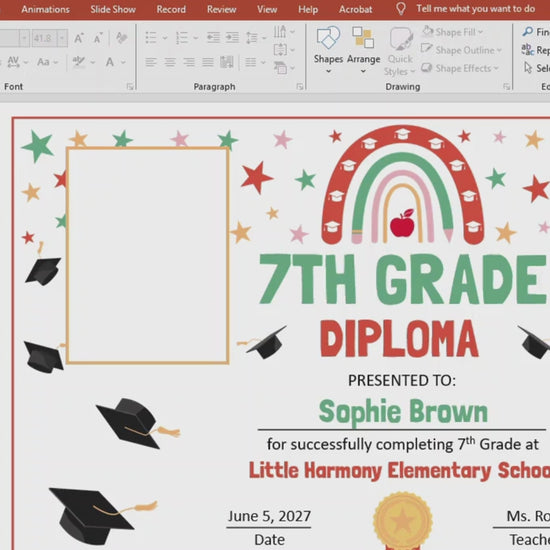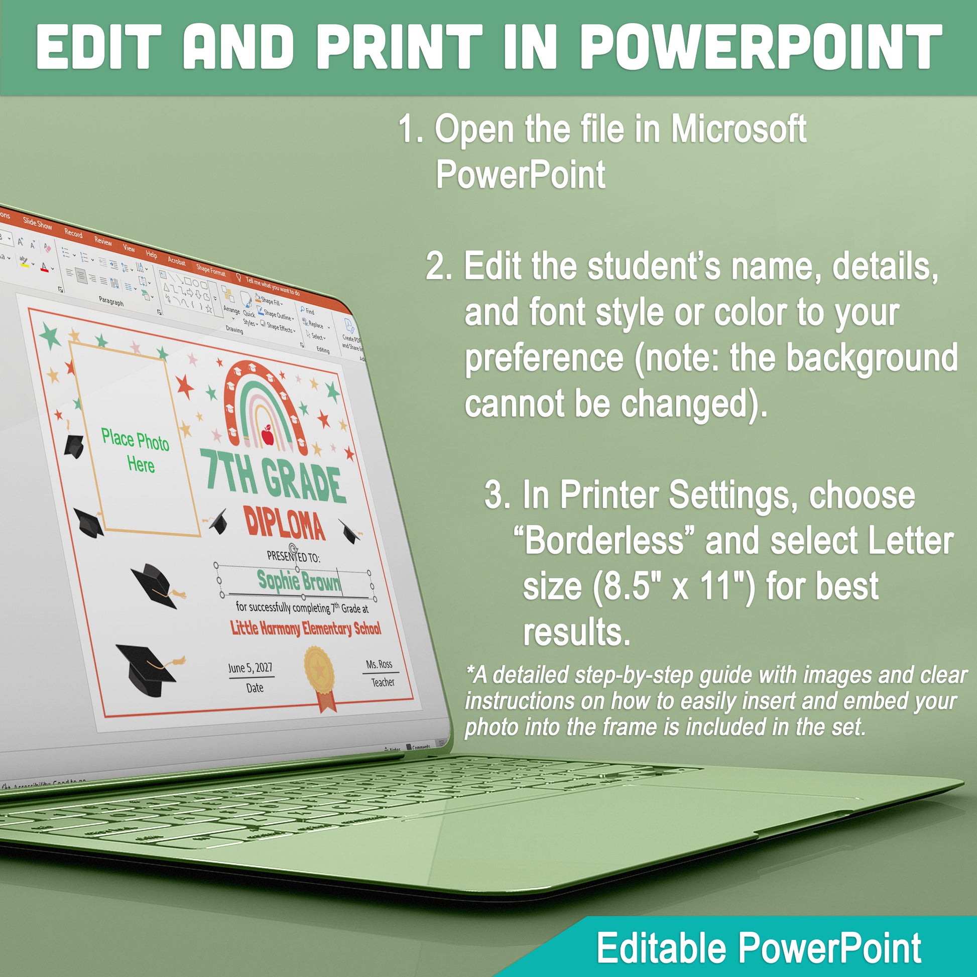 This set includes Two Graduation Award Styles, Photo and No-Photo Versions Included, so you can personalize each certificate in a way that works best for your class. You can also Choose the Award Title You Prefer, Diploma or Certificate, giving you flexibility for your event. All templates are fully editable in PDF and PowerPoint, except for the background image which is not editable. The set includes a detailed, step-by-step guide with images and clear instructions to help you easily insert and perfectly embed your photo into the frame using PowerPoint.