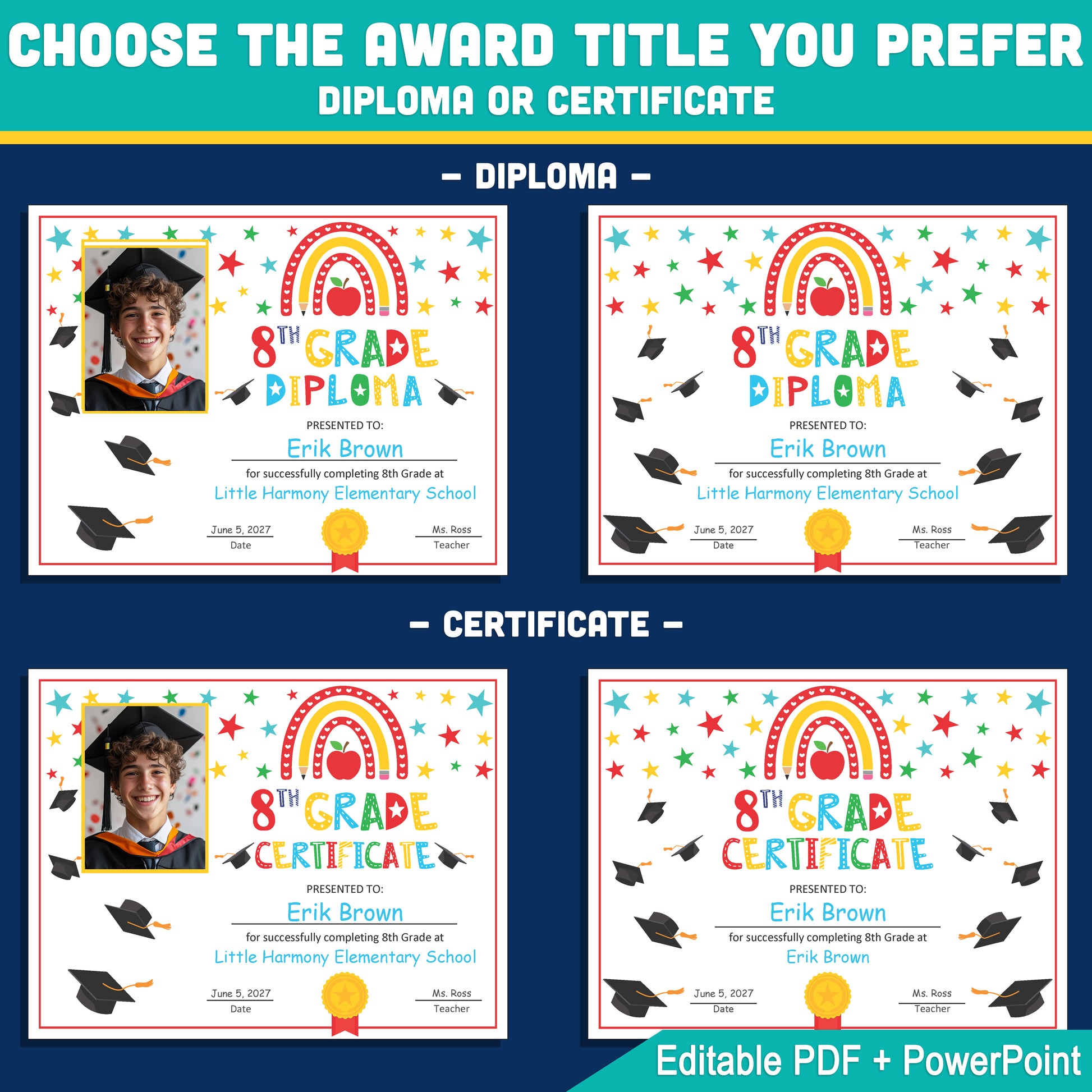 Editable 8th Graduation Diploma & Certificate Set, Rainbow Stars Graduation Awards, Photo or No-Photo Options, Edit in PDF, PowerPoint, Canva