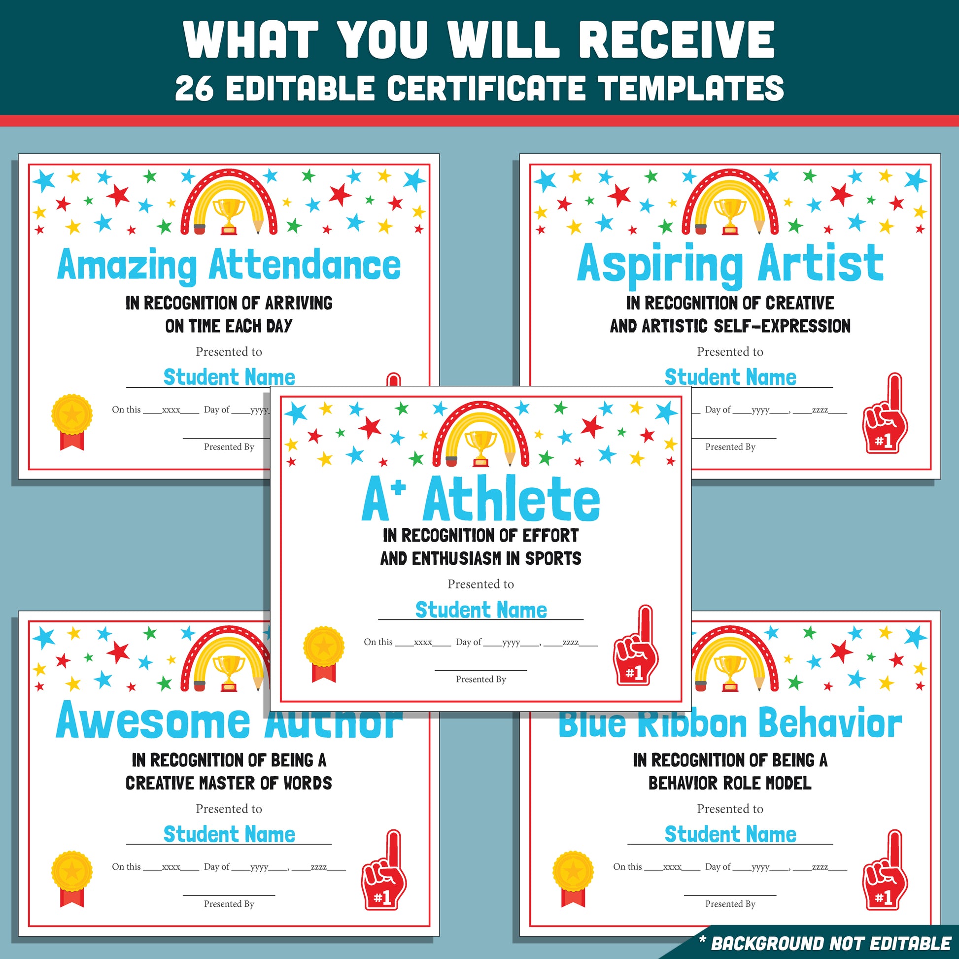 - There are 26 colorful certificates in this set. Enough so that each student can be recognized with a unique award.