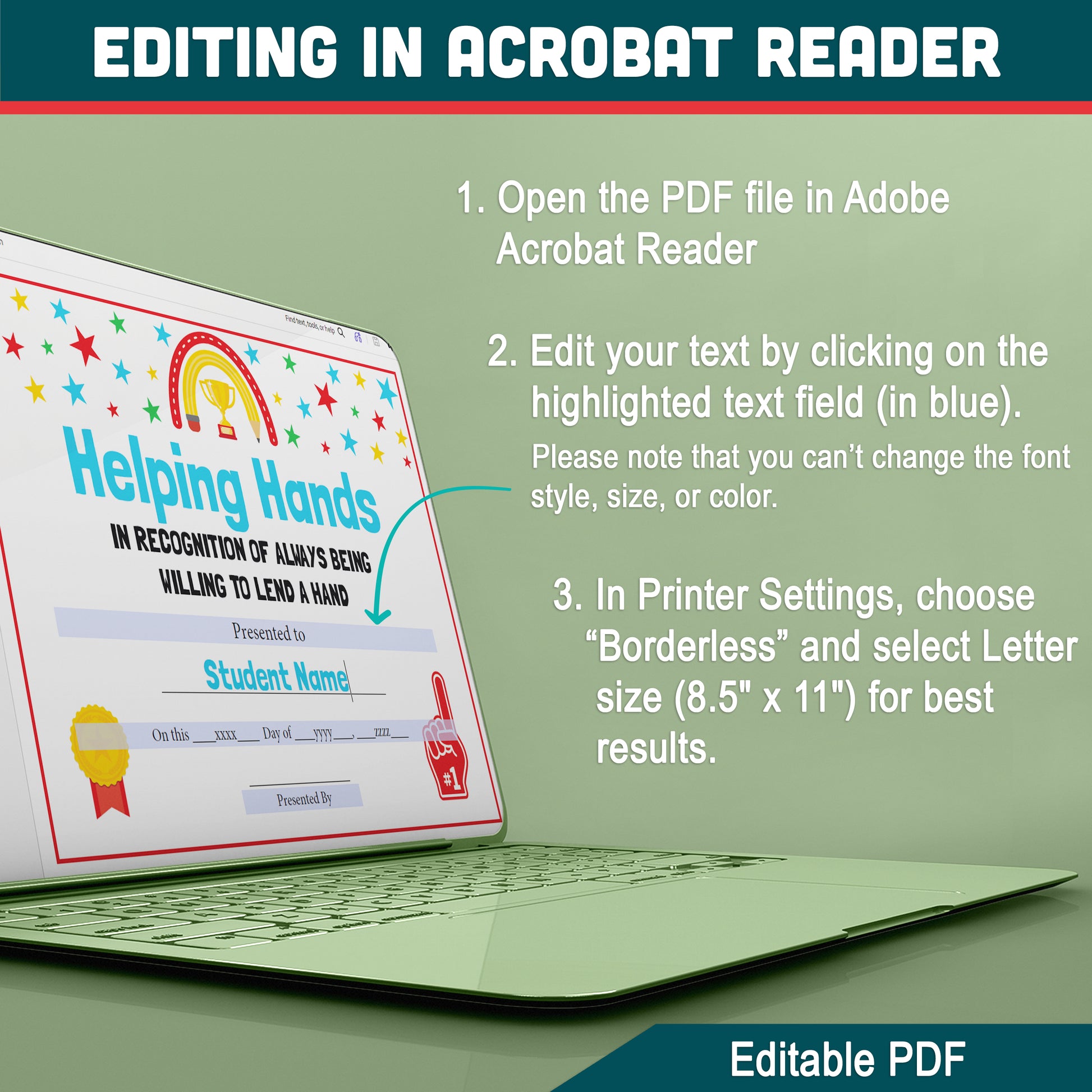 This set includes 26 certificates that you can edit in just a few clicks. The clean design prints clearly on regular paper, and the variety of award options helps you match each student with something meaningful.
