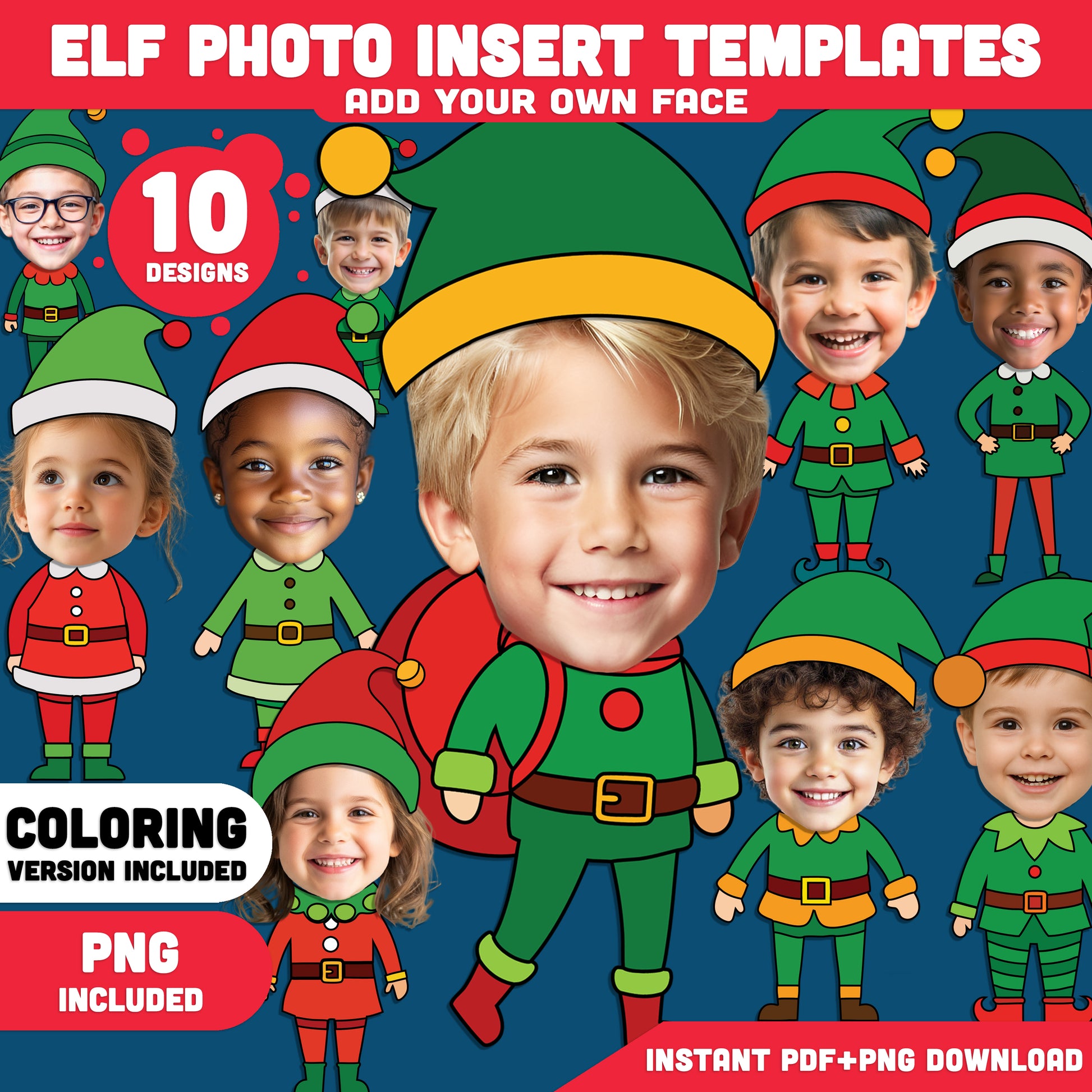 Elf Photo Insert Templates – Winter Body Templates, Coloring Version Included, 10 Designs, High-resolution PDF + PNG Files for Classroom Displays, Home Activities, and Holiday Parties