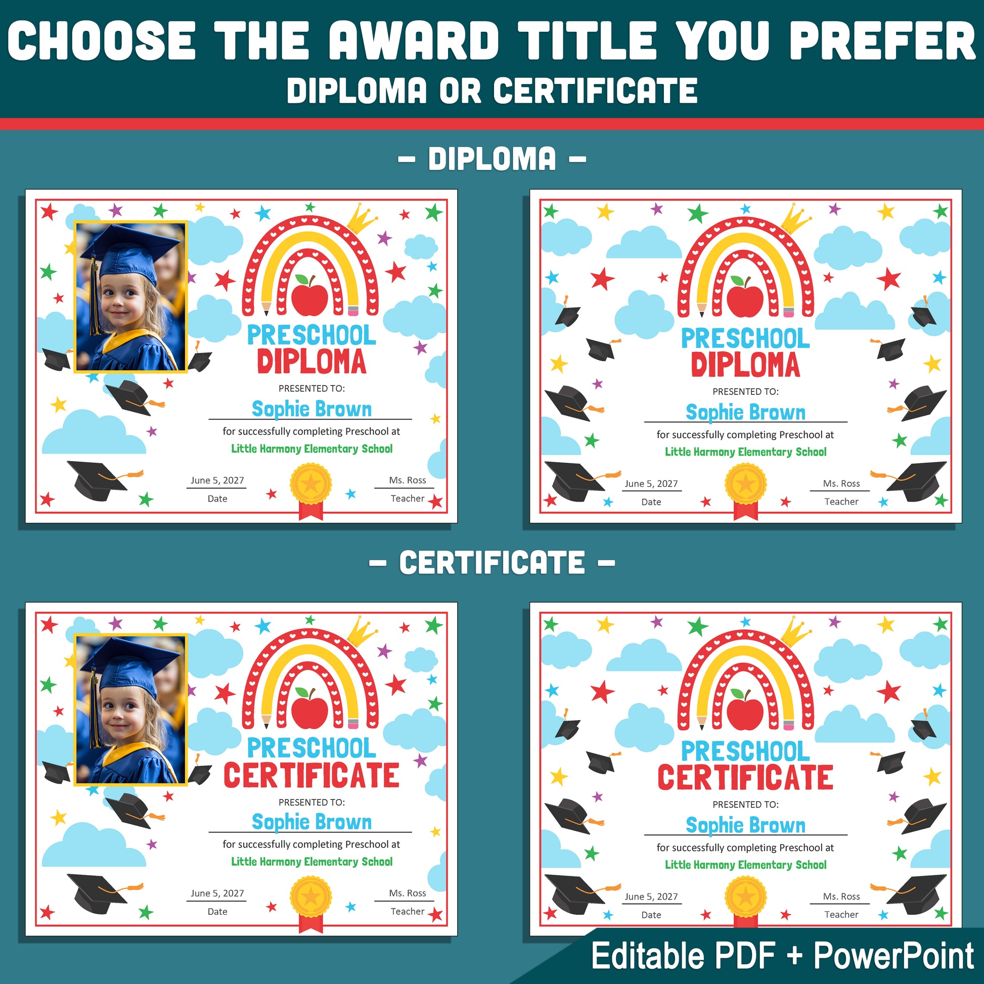 End of Year Certificates, Editable Awards and Graduation Diplomas for Preschool & Beyond, Any Grade, With and Without Photo, PDF and PowerPoint