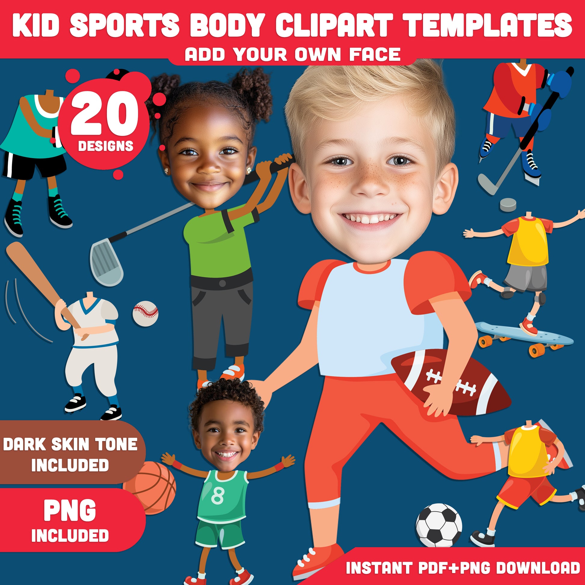 Kid Sports Body Clipart Templates – Add Your Face to 20 Fun and Active Sports Designs! Light + Dark Skin Tones, PDF + PNG Instant Download