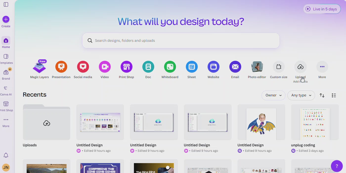 Click Create → Upload files to upload the PNG image you want to edit into Canva.