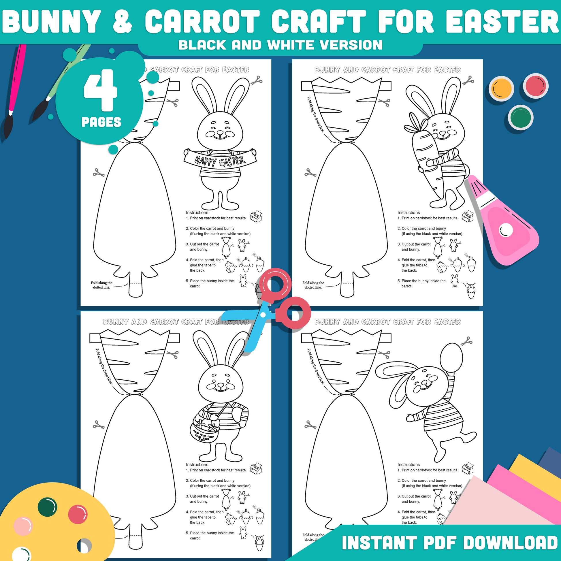 Paper Bunny and Carrot Craft for Easter, Bunny in a Carrot Craft Activity Printable, Spring Cut and Glue Craft Template, 4 Designs, 300 DPI PDF