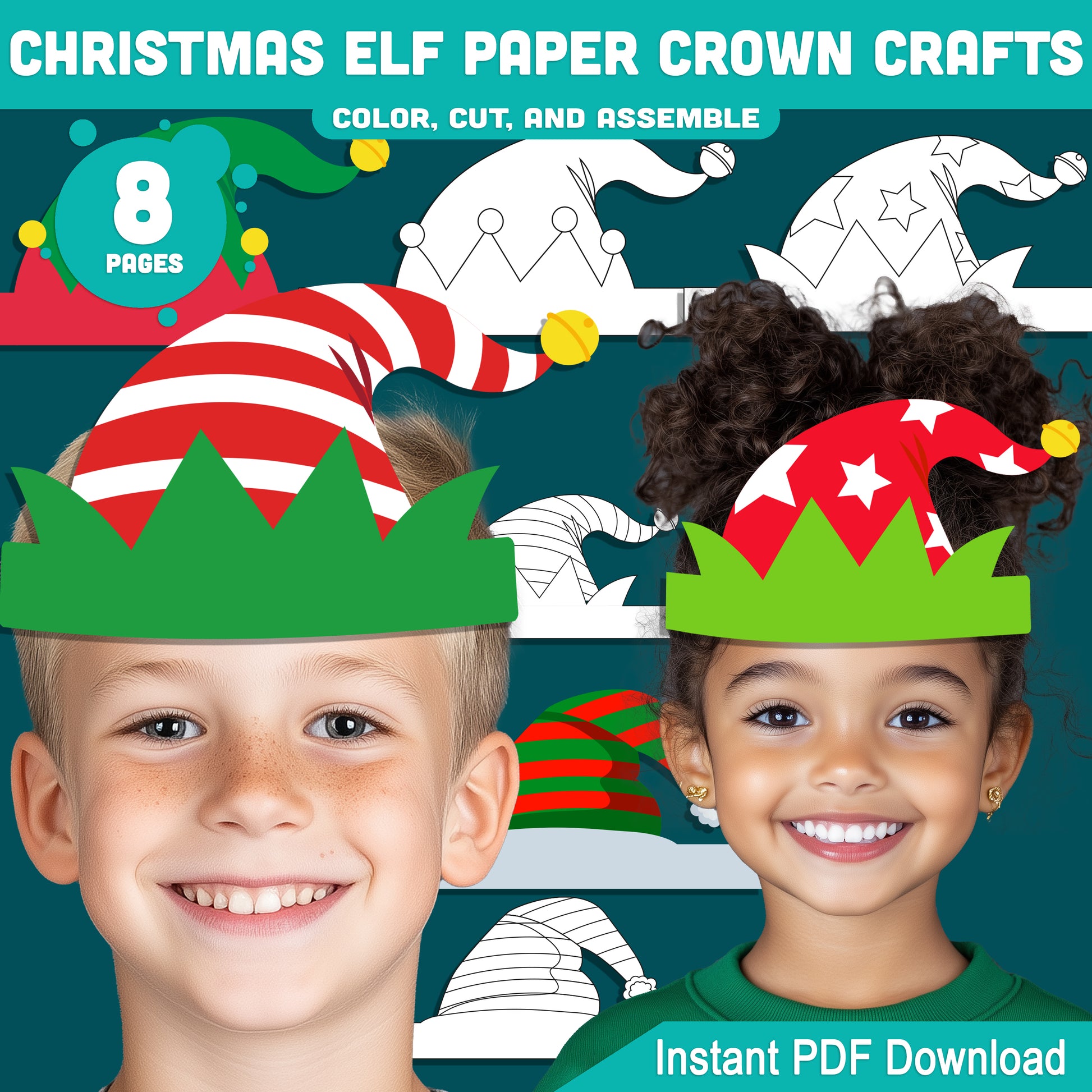 Printable Christmas Elf Paper Crown Crafts, Fun Winter Hat and Headband Activity, Christmas Play Paper Hat to Color, Cut & Assemble, 4 Designs, Pre-color + Black & White, Instant PDF Download