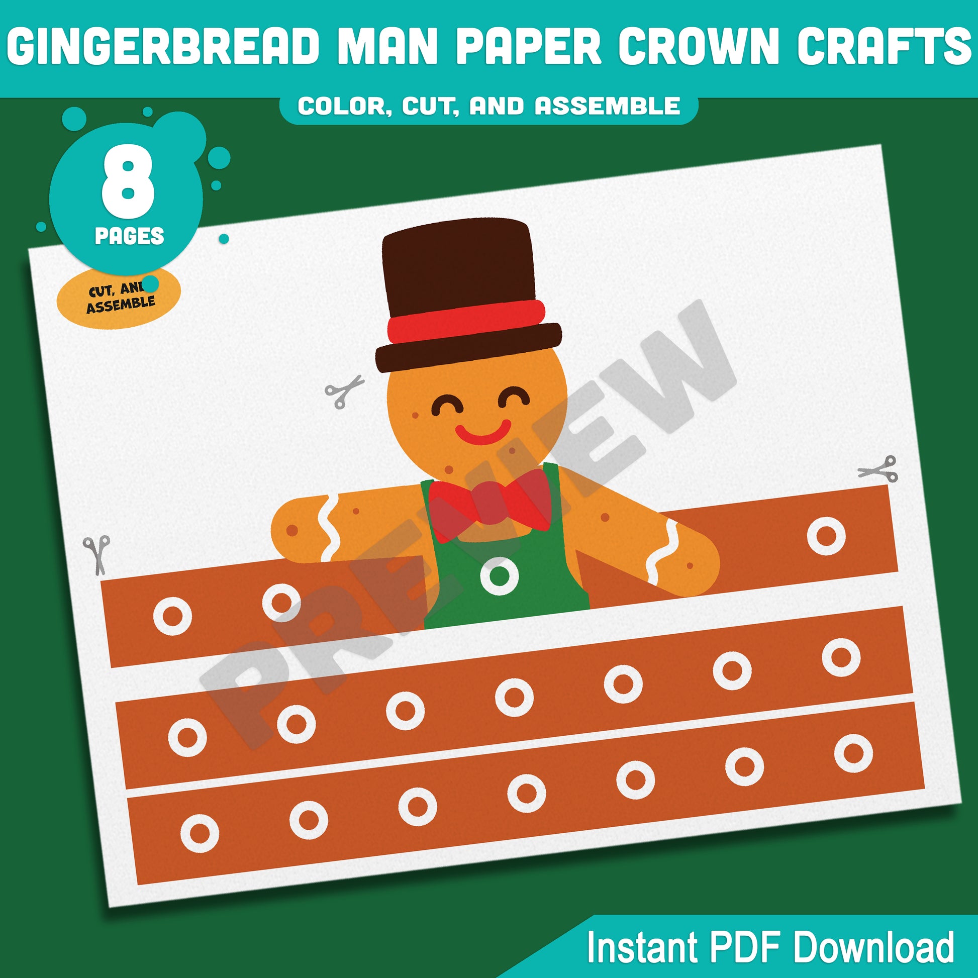 Printable Gingerbread Man Paper Crown Crafts, Christmas Hat and Headband Winter Craft, Holiday Party Paper Hat, Cut, Color & Assemble Activity, 4 Designs, Pre-color + Black & White