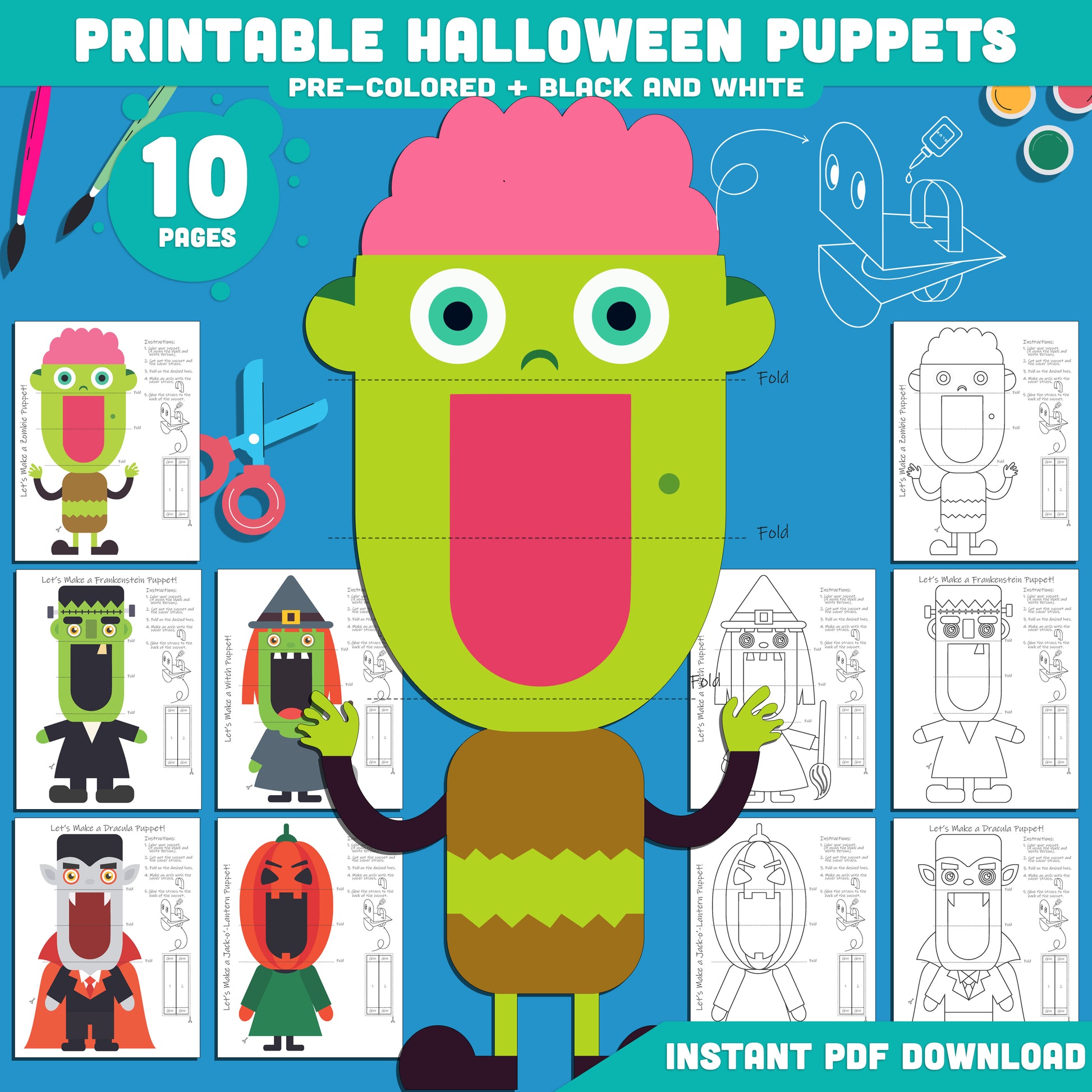 Printable Halloween Puppets: 10 Pages with 5 Pre-Colored + 5 Black and White Designs, Perfect for Spooky Classroom Fun & Halloween Party Crafts!