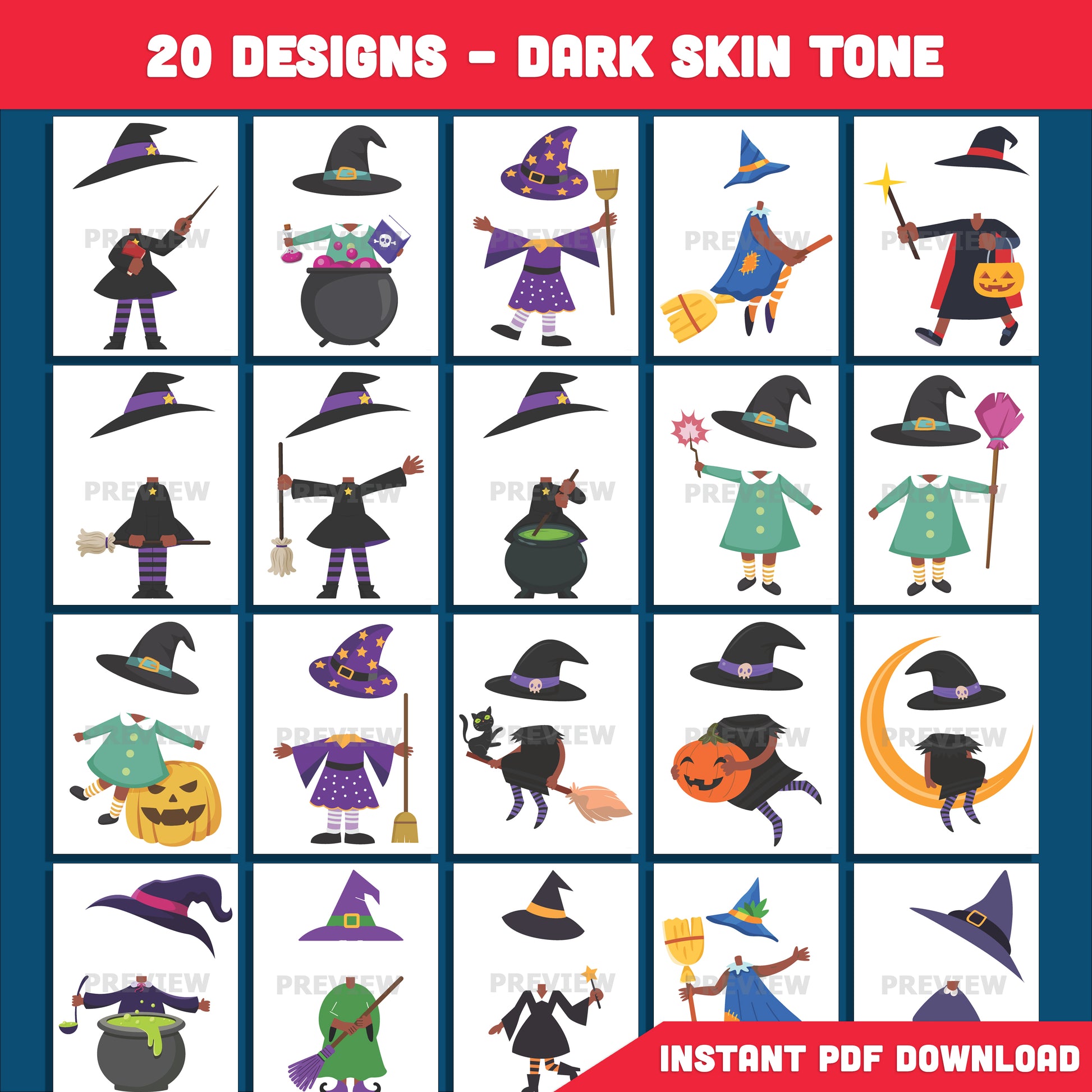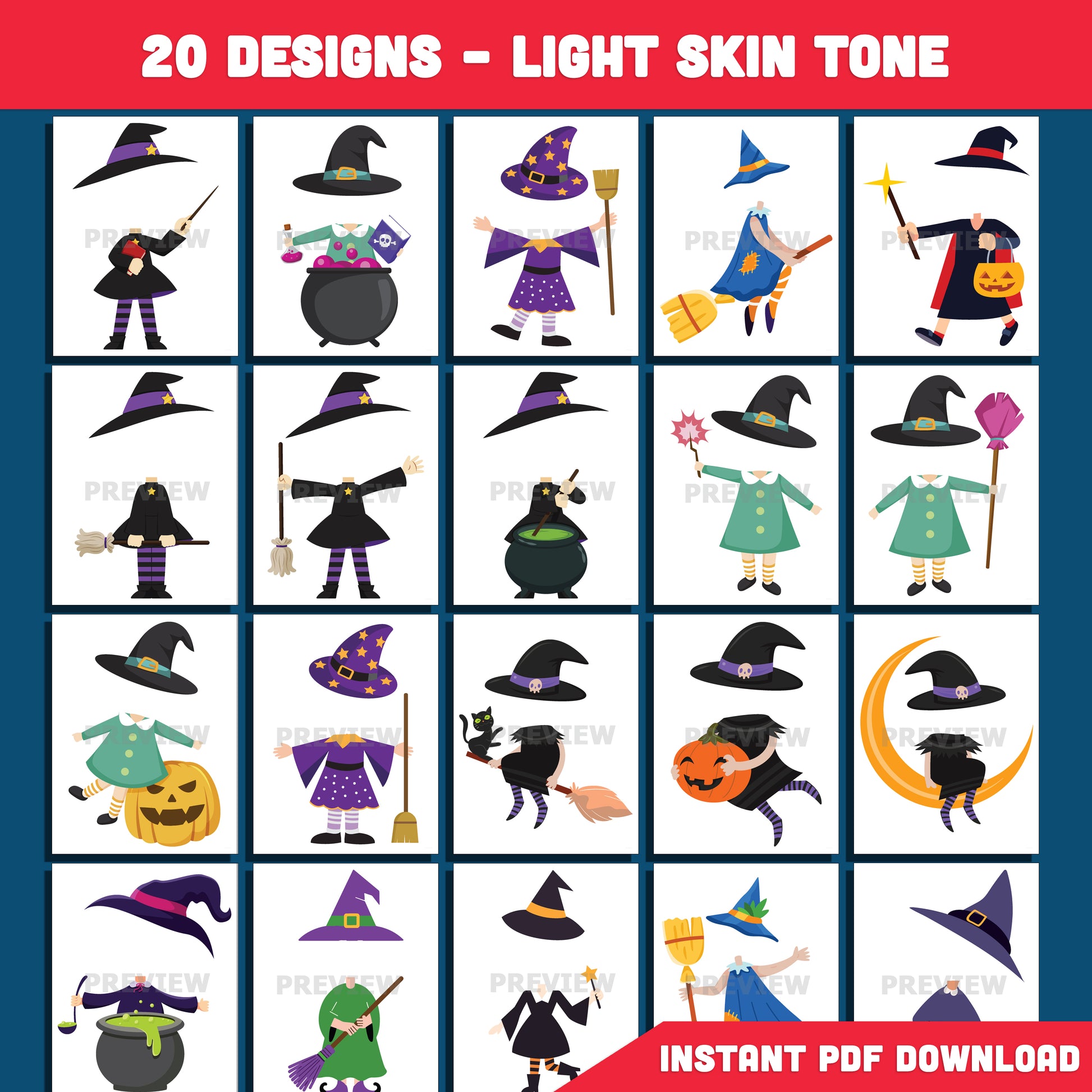 Printable Halloween Witch Body Templates for Kids, 20 Silly & Spooky Designs, Light + Dark Skin Included, DIY Face Cut & Paste Craft