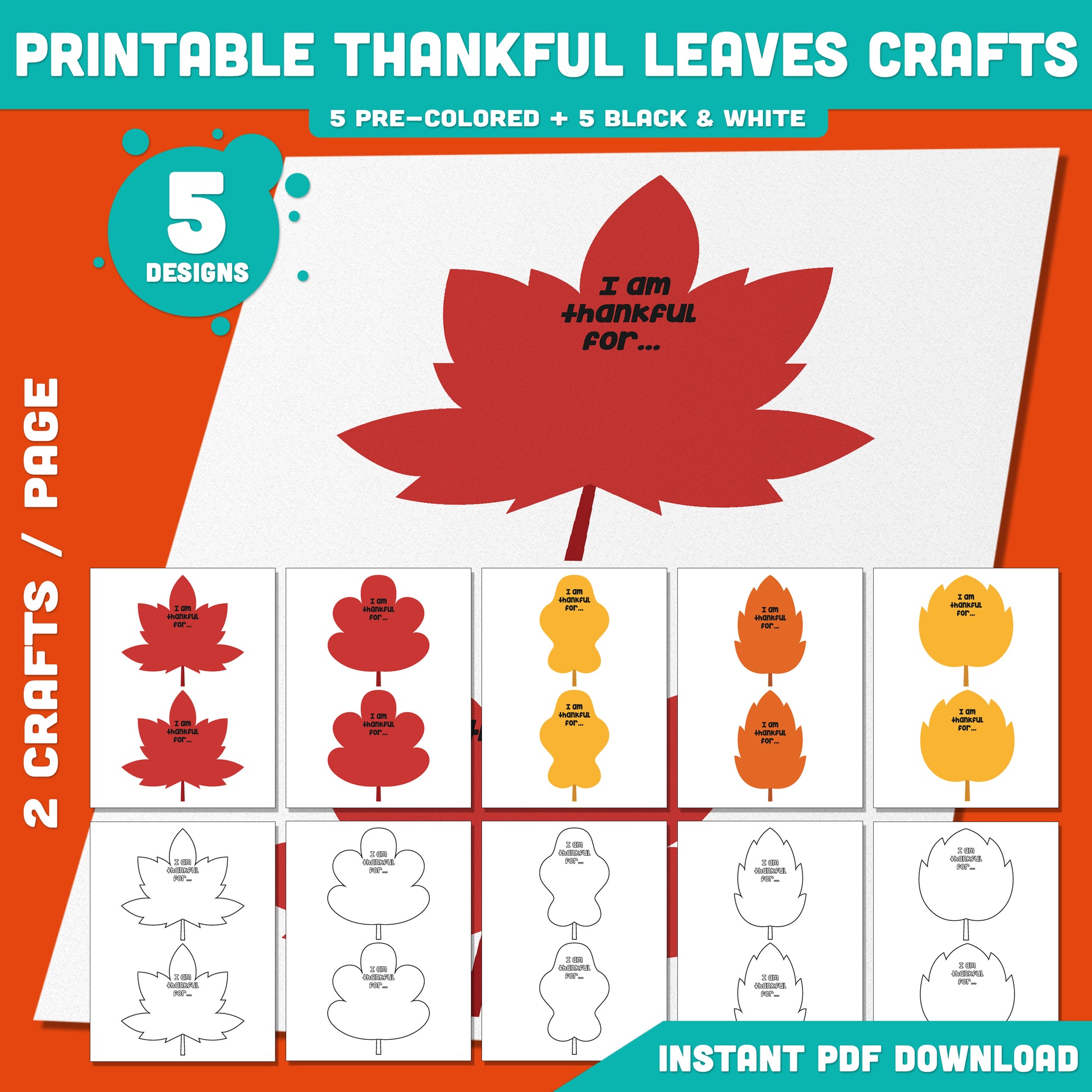 Printable Thankful Leaves Crafts – Thanksgiving Gratitude Activity, Fun Fall & Autumn Classroom Decor, Pre-colored + Black & White Pages, PDF Download