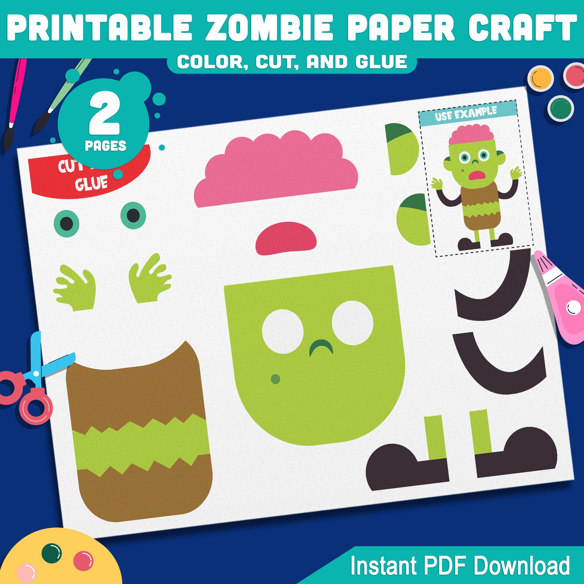 Printable Zombie Paper Craft for Kids – Fun Color, Cut & Glue Activity for Preschool, Pre-K, Kindergarten, Includes Pre-Colored & Black & White