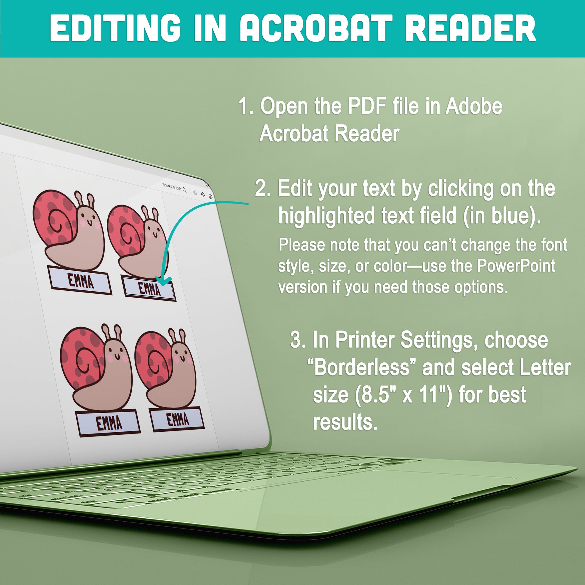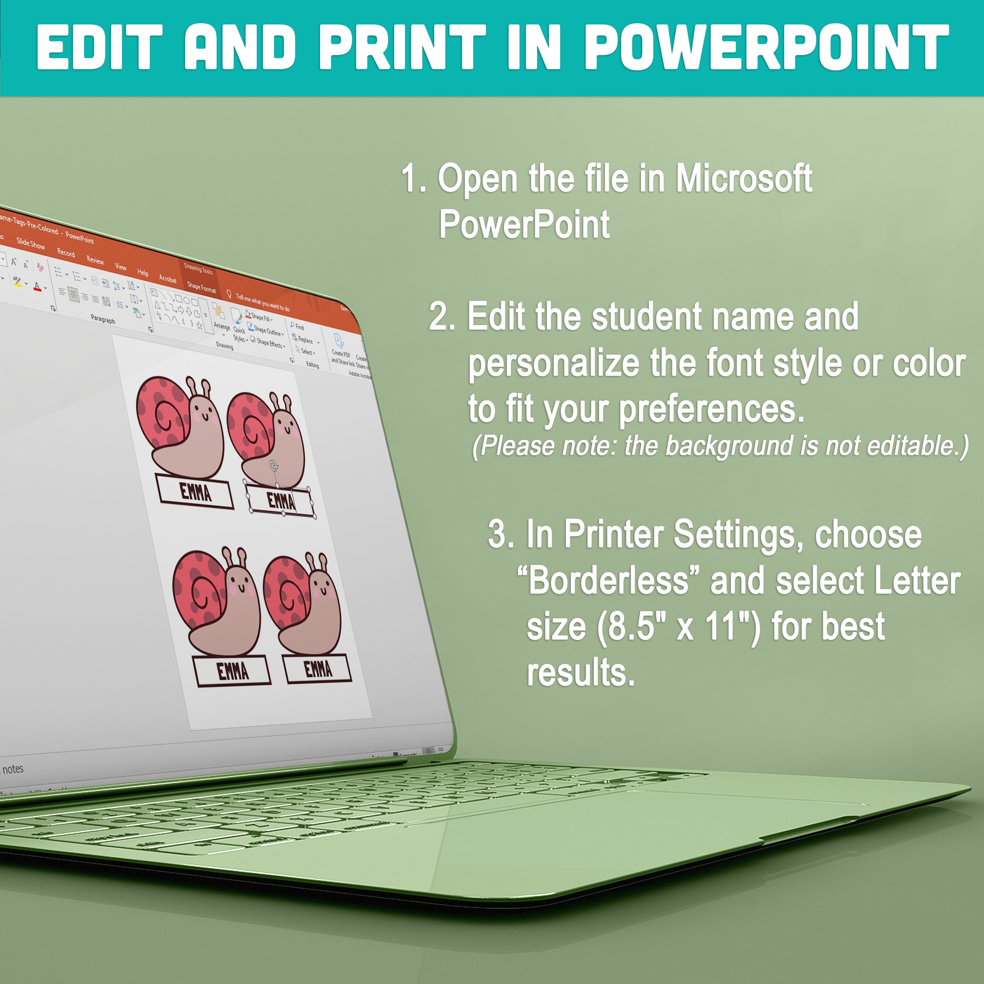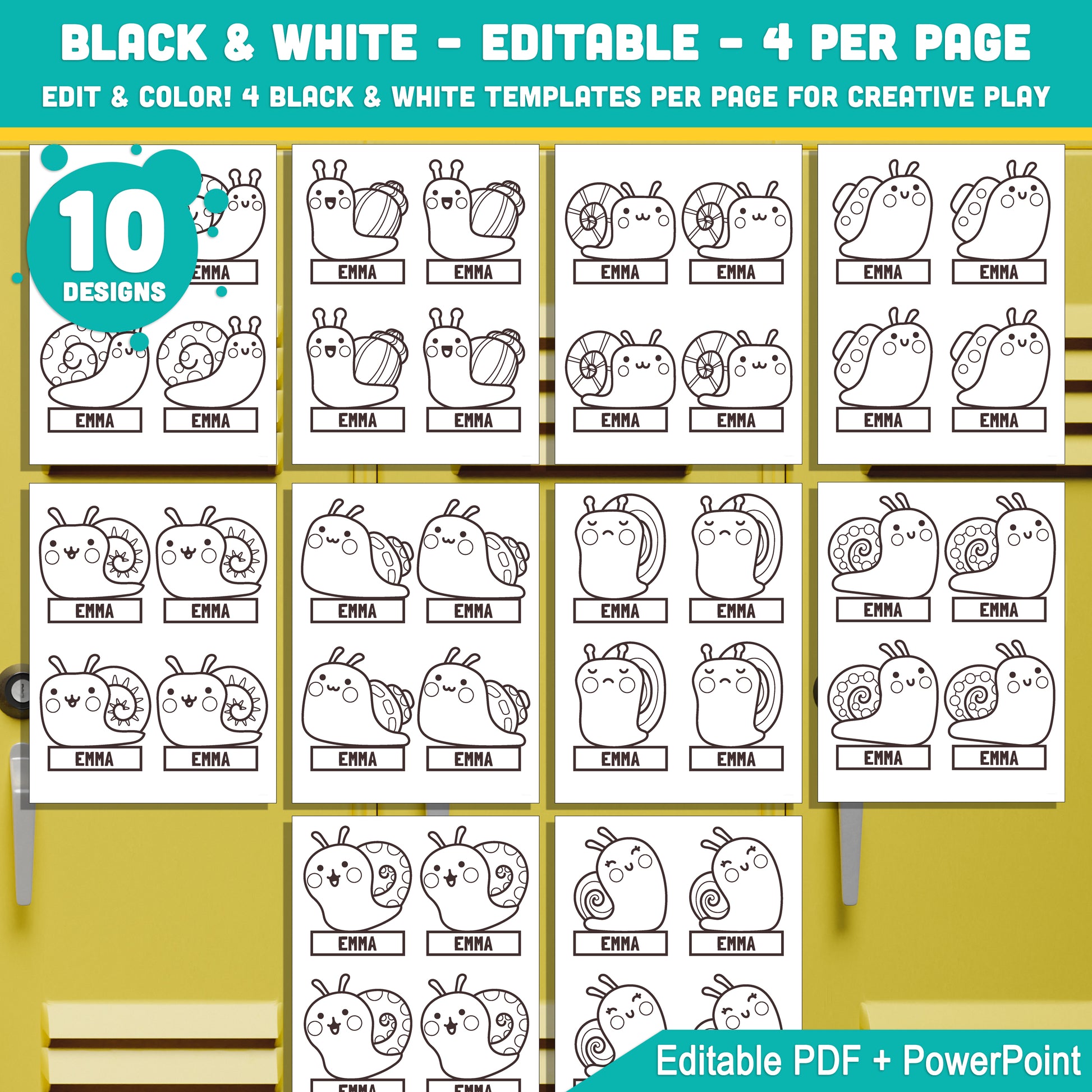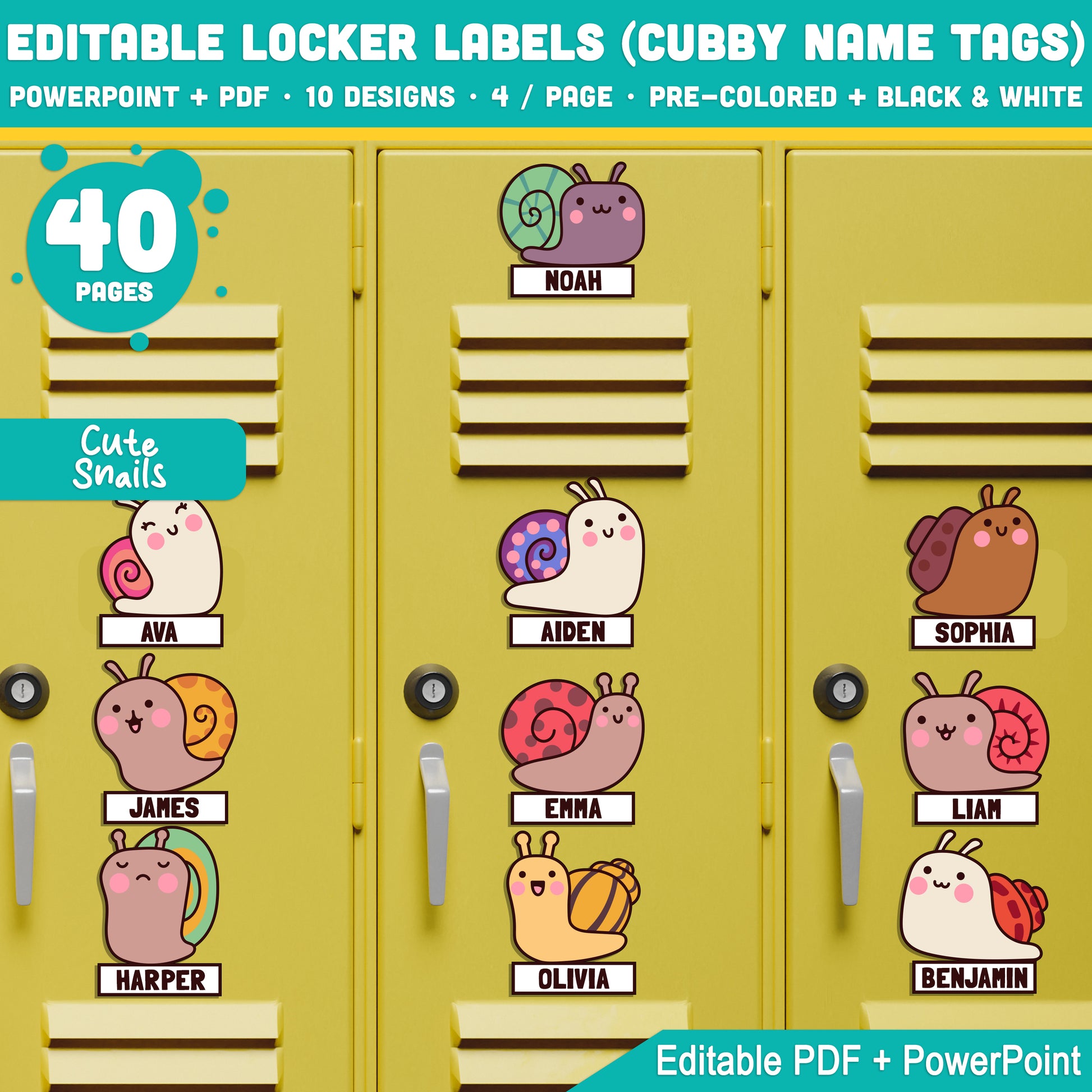 Snail Themed Editable Name Tags – 10 Locker & Cubby Label Designs, PDF + PowerPoint, Back to School Printable Set