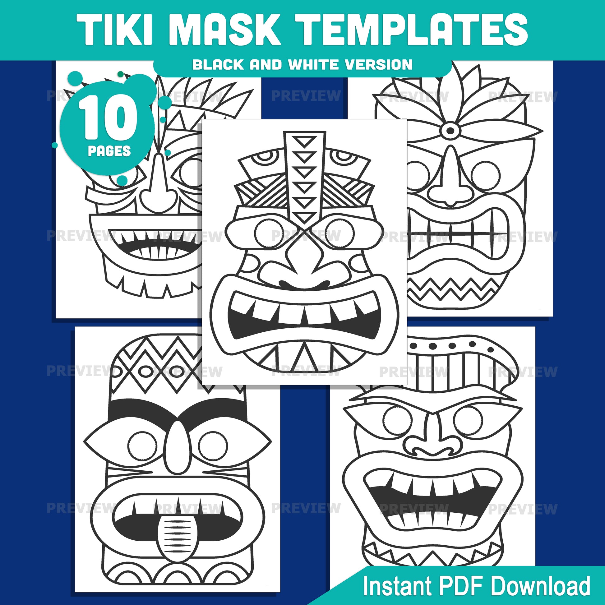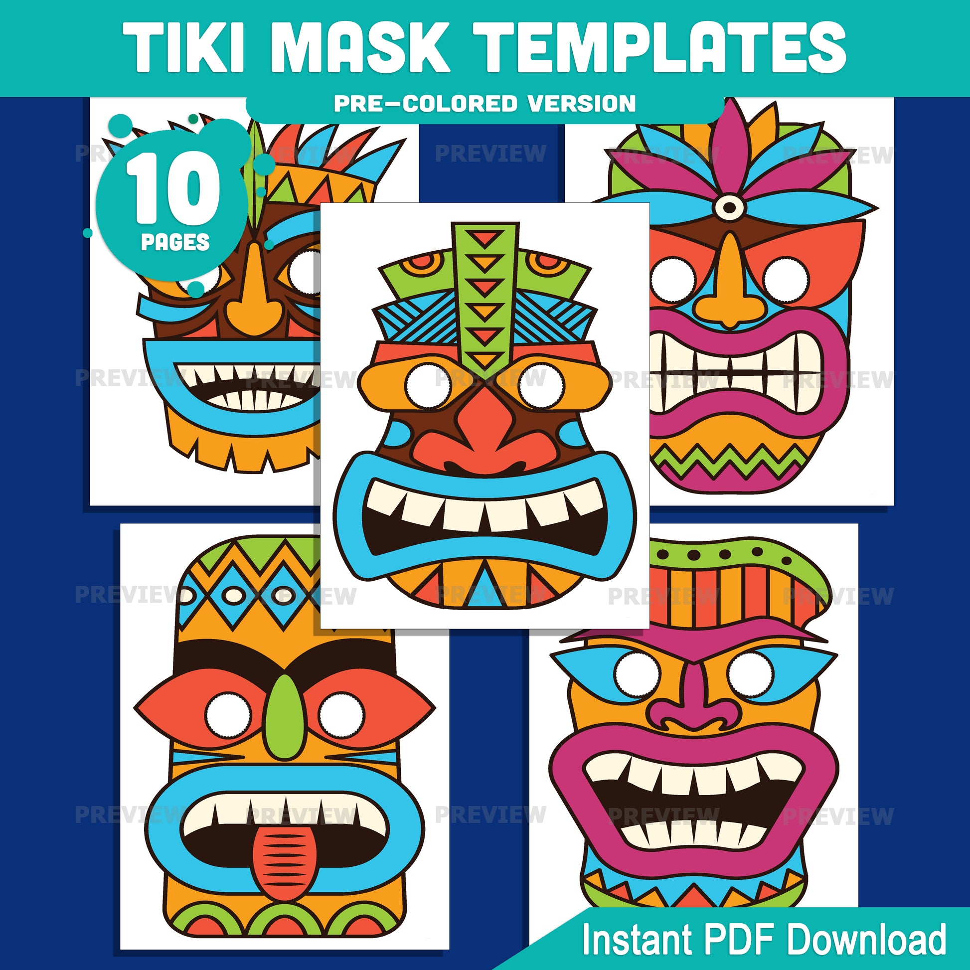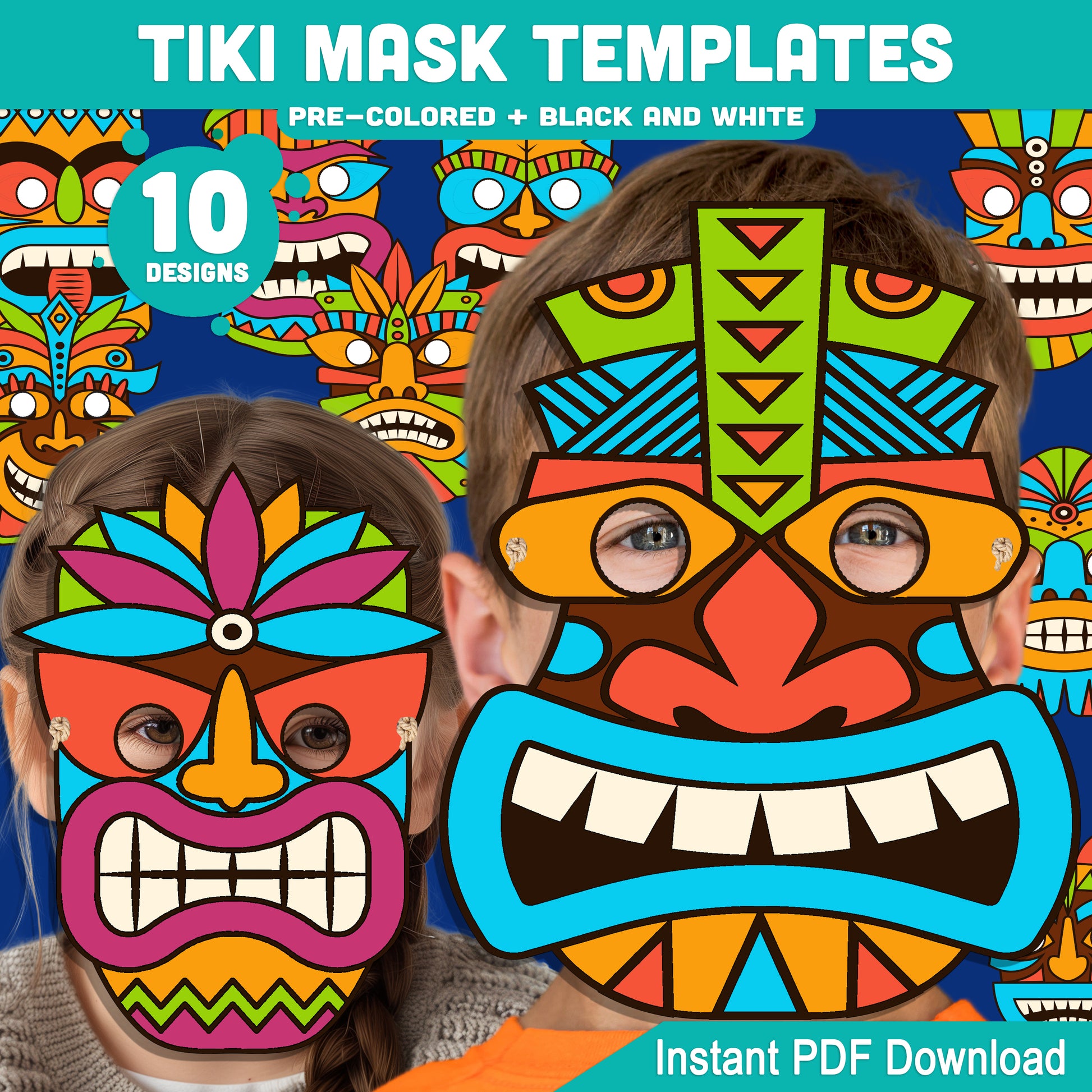 Tiki Mask Templates – Tropical Tribal Mask Printable Set, Paper Mask Craft with Extra-Thick Bold Lines, Pre-Colored and Black and White PDF