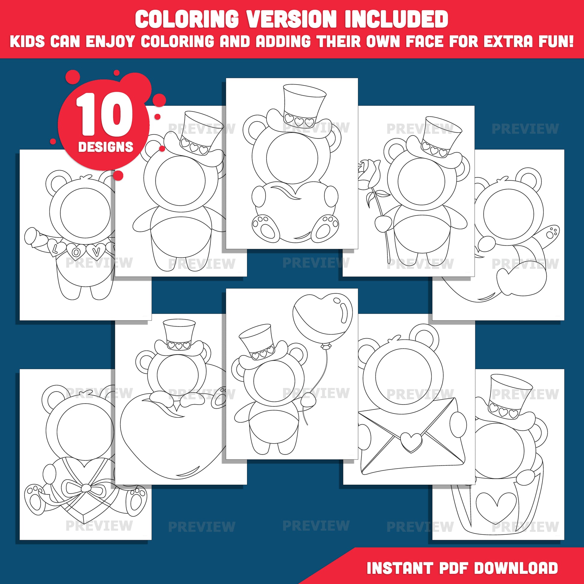 Valentine Bear Body Templates – Add Your Own Face Craft with Coloring Pages, Fun Valentine Classroom Activity, High-Resolution PDF & PNG